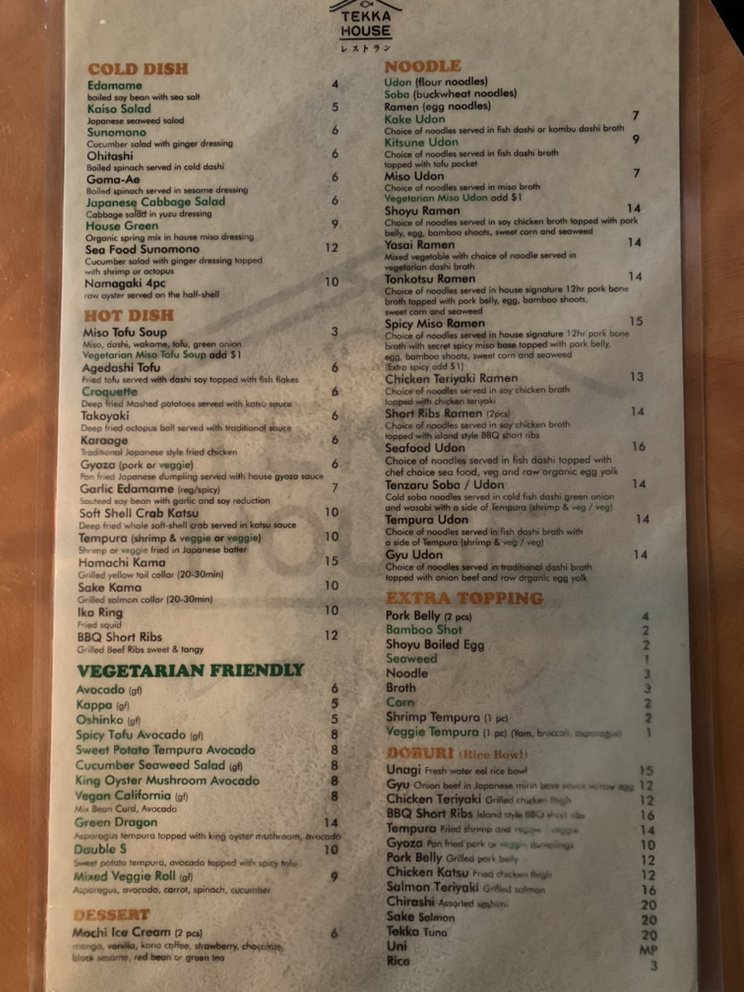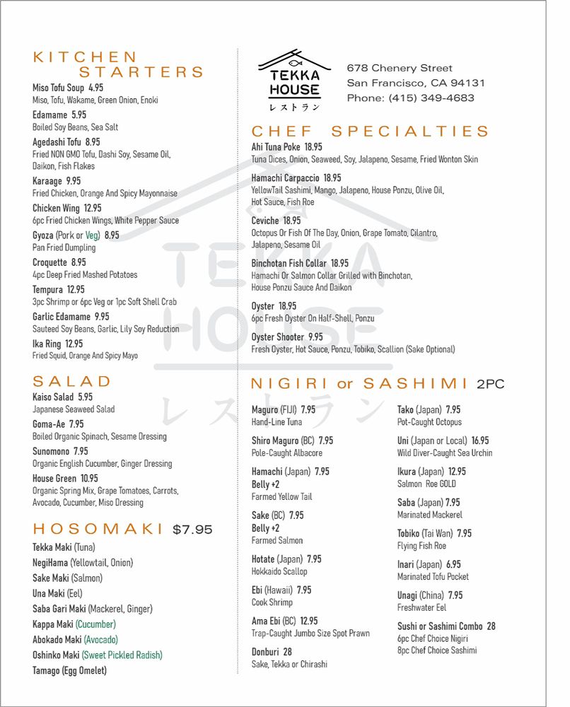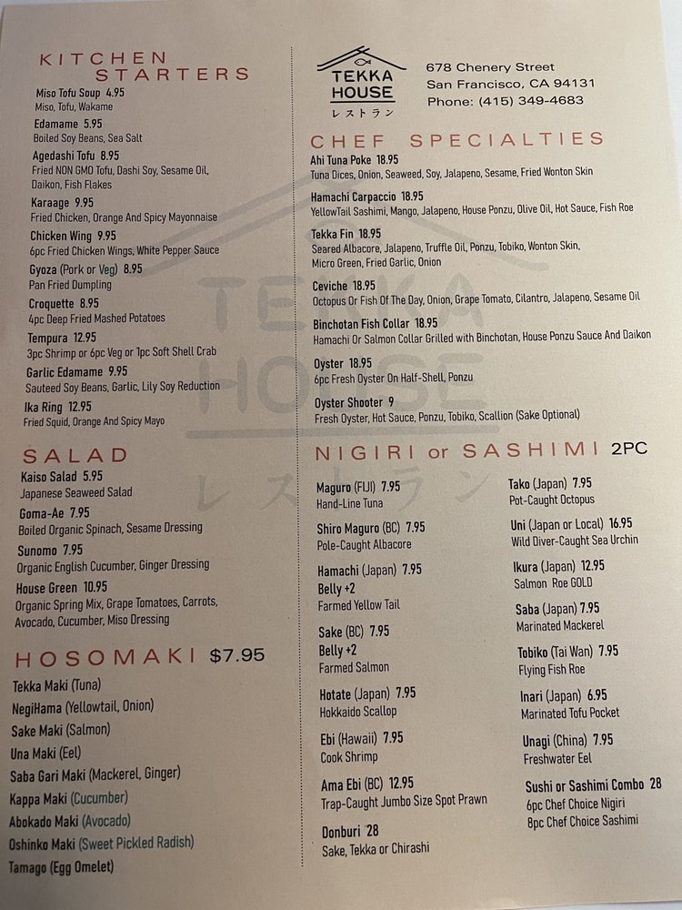 Welcome to Tekka House, a vibrant Japanese beer bar and sushi restaurant located in San Francisco. With a diverse menu catering to both meat-eaters and vegetarians, Tekka House offers a wide range of options for every palate. From the Line Caught Blue Fin Tuna Tasting to the flavorful Kitchen Starters and fresh Salad choices, every dish is crafted with care and precision. Customers rave about the hand rolls, ramen, and friendly service, creating a cozy neighborhood atmosphere that keeps them coming back for more. The ambiance at Tekka House is unique and inviting, making it the perfect spot for a casual dinner or group gathering. With a focus on fresh, sustainable fish and a variety of delicious dishes to choose from, Tekka House is a must-visit destination for sushi and Japanese cuisine lovers.